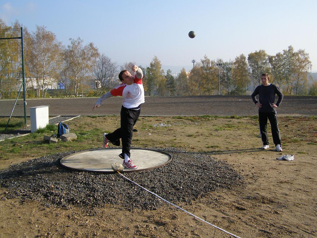 Štěpán předvádí hod do dálky, styl nedbalý.