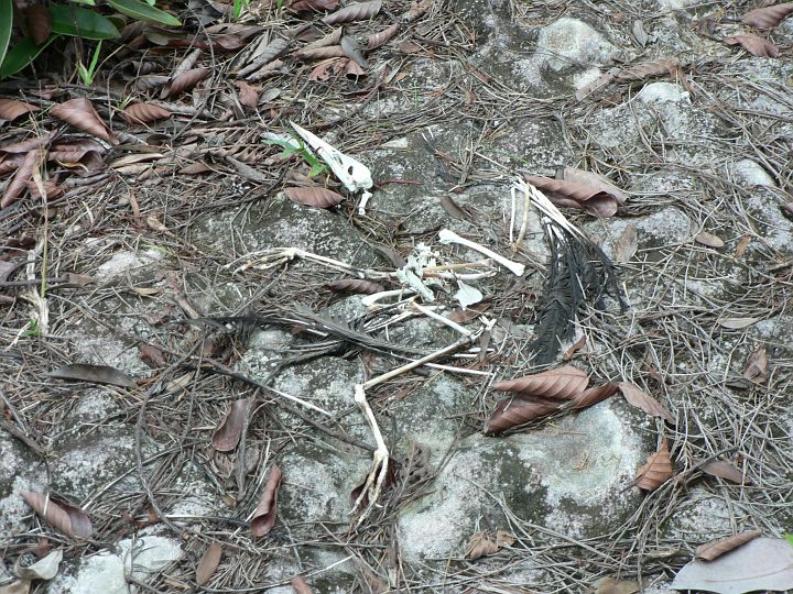 Zde umřel nějaký ptáček. Vidíte zobák, pařáty i křídla.