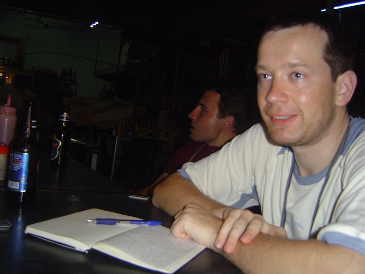 | Kroci přemýšlí, co napíše do svého deníku. Upozorňuji, že do deníku jde jen to, co je politicky přípustné. Jinak třetinka piva zde stála 12 ringitů (76 Kč) z toho 12 korun se platí za to, že nás tady oblážuje náš malajský rocker. | |