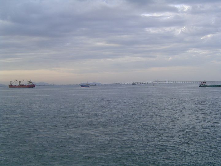 Lodě a vzadu most spojující ostrov Penang s pevninou.